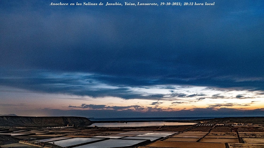 Vista panorámica tomada desde el borde noroeste de Janubio, en primer plano las salinas y la laguna, en segundo, el escarpe, hoy separado completamente del mar abierto,y al fondo Los Ajaches (Mtñas de la Cinta, Enmedio, El Cabo, Atalaya de Femés...)